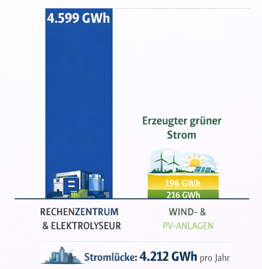 Über 90% des Stroms müssen dauerhaft aus dem öffentlichen Netz bezogen werden. Da die Stadt angibt den Elektrolyseur, das Rechenzentrum und dann andere Abnehmer zu versorgen, bleibt für die Stromversorgung der Bürgerschaft faktisch kein lokaler Ökostrom mehr übrig. Letztlich entscheidet vermutlich ohnehin der Investor über die wirtschaftlichste Verwertung des Stroms, weshalb eine Preissenkung für Stadtwerkekunden mehr als fraglich bleibt.
